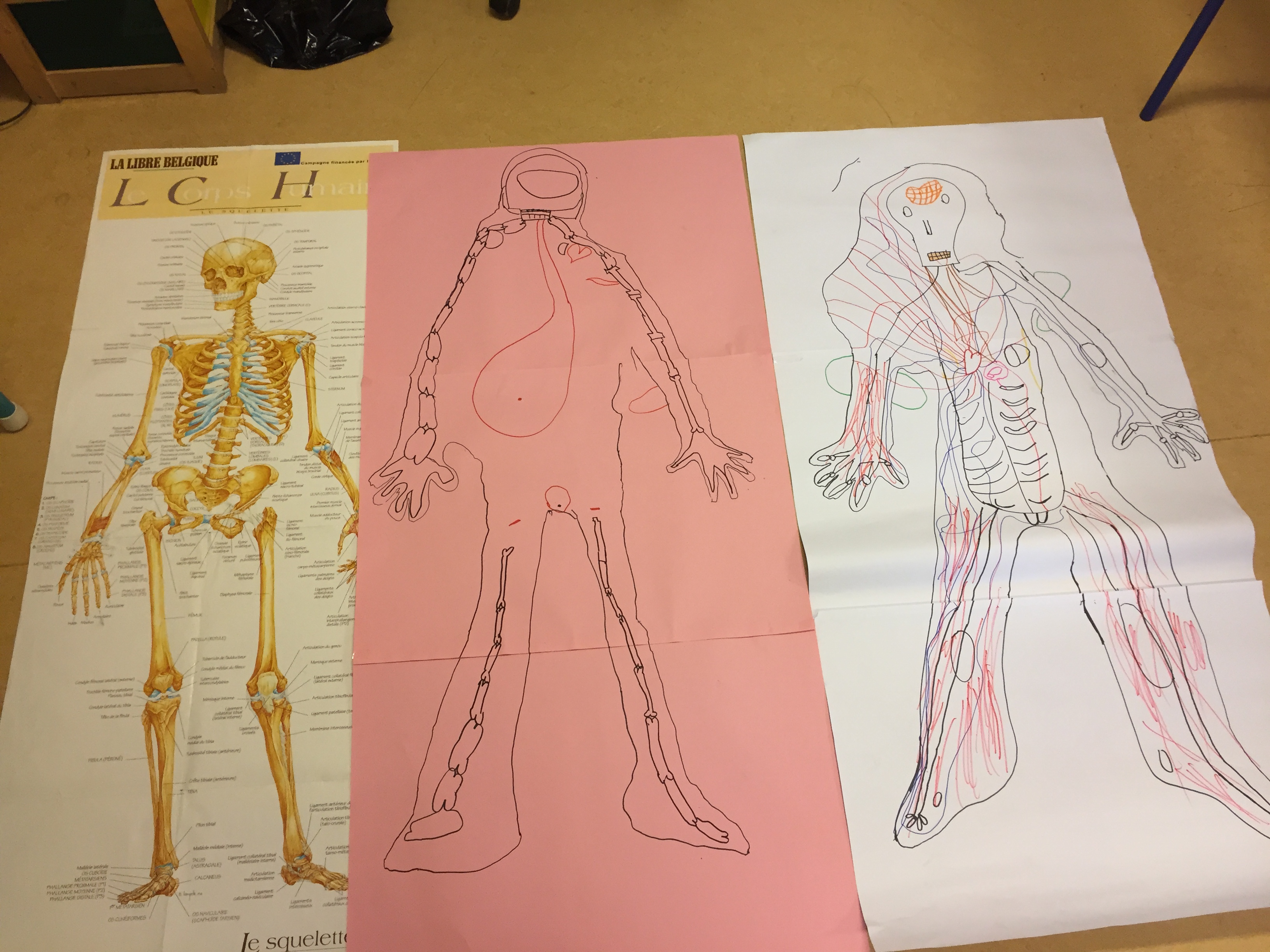 Faire émerger une énigme à résoudre (qu’est-ce qu’il y a dans notre corps que l’on ne voit pas de l’extérieur ?) ; dégager et échanger des pistes de recherche (échanges d’idées entre les élèves de M3&P1&P2 ) ; investiguer et récolter des informations (radiographies, livres, planches de bibliothèque, dessins …) et structurer les résultats (comparer son dessin avec les documents).